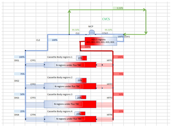 The EU-DEMO Divertor PHTS have been simplified in OSCAR-Fusion lumping its 48 tokamak sector distributors (one for each Divertor cassette) in four branches. Figure 3 shows a simplified scheme of the model used in OSCAR-Fusion for the divertor cassette PHTS. Roughly 60 regions have been used for the BOP and the in-vessel components. Missing design information, especially those concerning the CVCS layout, have been obviated using fission-derived data.