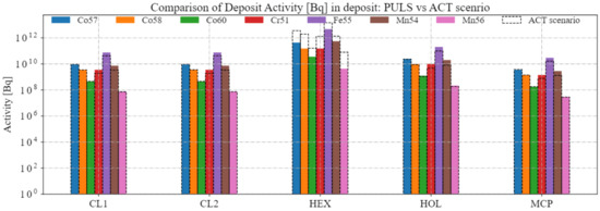 Figure 4 and Figure 5 show the deposit activities in Bq for the ex-vessel component CL1 (Cold Leg no. 1) and for the heat exchanger at the ex-vessel maintenance times (74, 348, 427, 699, 972, 1051 days). These intervals have been chosen according to the preventive maintenance scheduled for DEMO, where working personnel is called to access the ex-vessel PHTS vaults. Significant radionuclides inventories are already measurable at the first ex-vessel maintenance intervention.