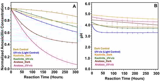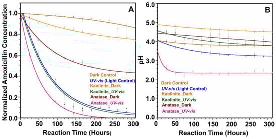 Conversely, the amoxicillin degradation was lower in kaolinite (band gap = 4.99 eV) [43] presence under irradiated conditions than the Light Control. The observed rate constant was 0.00105 h−1 (R2 = 0.997) with a half-life of 660 h. The photocatalytic effect of the kaolinite for amoxicillin degradation is insignificant due to limited light penetration in the presence of clay particles. However, the observed 20% amoxicillin loss over the 14 days could be attributed to the hydrolysis of amoxicillin via hydroxyl groups on the kaolinite surface. The pH of the point of zero charge (pHPZC) of kaolinite lies between 6 and 6.5 [44]. Figure 1B shows that pH of the kaolinite reaction under light varies from 4.5 to 3.8, and the kaolinite surface will be positively charged. Amoxicillin owns both negative and positive charges in its structure at this pH. Hence, amoxicillin can be adsorbed to the positively charged kaolinite surface via an ionized carboxylate group. This is further confirmed by the 20% amoxicillin loss in the presence of kaolinite under dark conditions (Figure 1A). Moreover, we observed a 5-fold increase in amoxicillin degradation compared to the Dark Control, which reveals the catalytic effect of the kaolinite surface to increase the hydrolysis of the β-lactam ring.