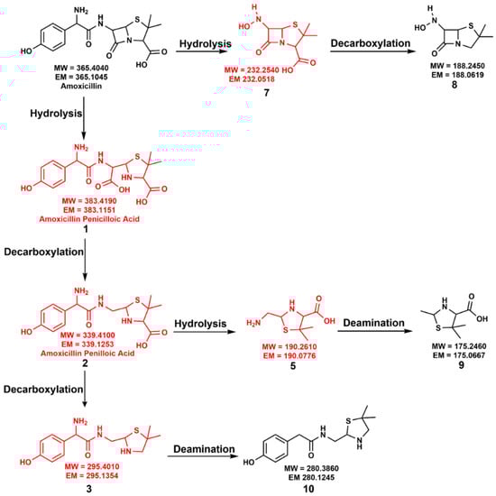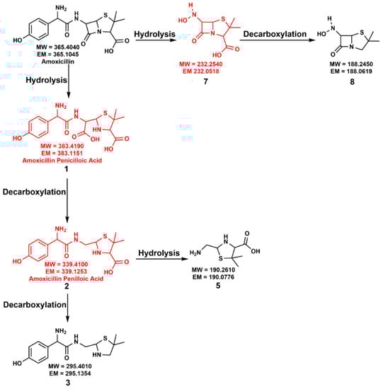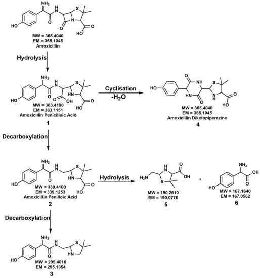 - Nägele, E.; Moritz, R. Structure elucidation of degradation products of the antibiotic amoxicillin with ion trap MSn and accurate mass determination by ESI TOF. J. Am. Soc. Mass Spectrom. 2005, 16, 1670–1676. [Google Scholar] [CrossRef] [Green Version]