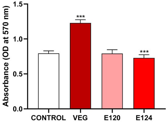 To test viability, cells were seeded in 96-well plates at the density of 5 × 104 cells/well, starved (1% FBS) for 24 h, and treated with vegan red, E120, or E124 for 24 h. The day after, 10 µL of 3-[4,5-dimethylthiazol-2-yl]-3,5 diphenyltetrazolium bromide (MTT) were added to each well for 4 h at 37 °C and 5% CO2. Then, the medium was gently aspirated and substituted with a solution of isopropanol and DMSO (1:1) [23]) to dissolve the formazan crystals produced in each well. The absorbance of the solution was measured at 570 nm using a microplate reader. Each assay was performed in triplicate.