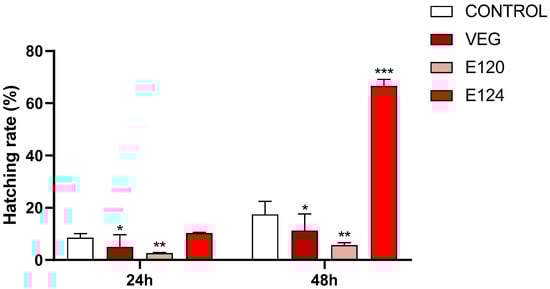 Hatching rate (%) at 24 and 48 h in Artemia salina cysts exposed to vegan red VEG, E120 or E124. Notice the significant decrease induced by VEG and E120 at both 24 and 48 h and the increase induced by E124 at 48 h. (Data are mean ± SEM; * p < 0.05; ** p < 0.01; *** p < 0.001).