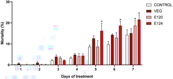 Mortality percentage in Artemia salina nauplii exposed to vegan red VEG, E120, or E124. Notice the significant increase registered for E124 since day 5 and for E120 on day 7. (Data are mean ± SEM; * p < 0.05).