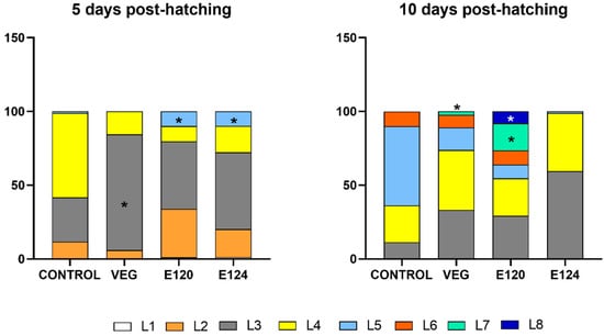 Naupliar stages (%) in Artemia salina samples exposed to vegan red VEG, E120, or E124. Five days from hatching. VEG delays (increased percentage of L3 nauplii; *) and E124 and E120 accelerate (appearance of L5 nauplii; *) development. Ten days from hatching. Moderate and significant acceleration of development in VEG and E120 (presence of L7 and L7 and L8 nauplii respectively; *). In E124, are present only L3 and L4 nauplii.