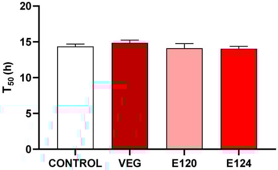 Effect of vegan red VEG, E120, or E124 on the time (h) to obtain a 50% of Cucumis sativus seeds germinated (T50). Data are mean ± SEM (n = 20). No significant differences are evident among treatments.