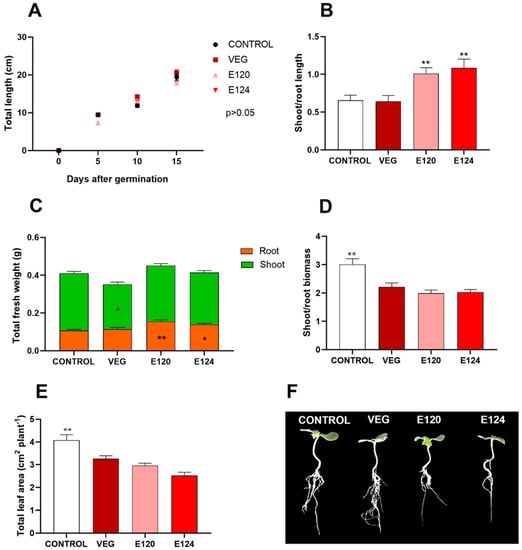 Effect of vegan red VEG, E120 or E124 on Cucumis sativus seedlings elongation (up to 15 days) (A), and on shoot/root ratio in terms of length (B), total fresh biomass and distribution between shoot and root (C), shoot/root ratio in terms of fresh biomass (D), total leaf area (E) of Cucumis sativus seedlings at 15 days after germination. Individual seedlings at 15 days are compared in (F). (Data are mean ± SE; n = 20; * p < 0.05; ** p < 0.01).