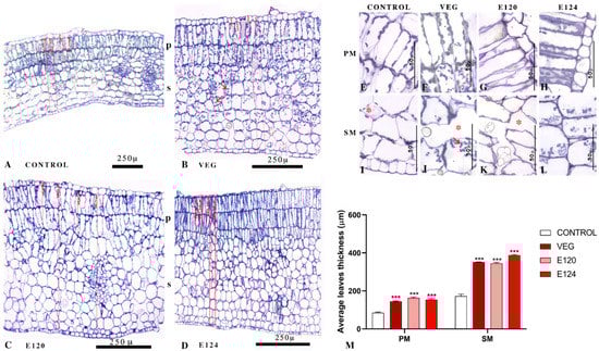 Effect of vegan red VEG, E120, or E124 on cotyledonary leaves. (A): normal morphology of palisade (p) and spongy (s) mesophyll. (B–D): hyperplasia and hypertrophy of mesophyll. Arrows indicate amyloplasts. Vertical red lines indicate some of the measures used to determine average thickness. Detail of palisade (E–H) and spongy (I–L) cells. Notice the presence of large intercellular spaces (asterisks) and the increase in amyloplasts after VEG treatments (arrows). (M): Average thickness of spongy (SM) and palisade (PM) mesophyll. (Data are mean ± SE; n = 20; *** p < 0.001).