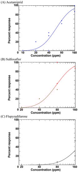 Toxicity responses of Apis mellifera to different systemic pesticides: acetamiprid (A), sulfoxaflor (B), and flupyradifurone (C) through ingestion bioassays (at 48 h after treatment). The points represent percent response; when two replications had the same percent response, the points overlapped.