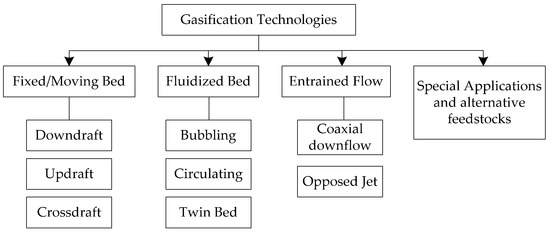 Biomass gasification for energy generation may appear to be a new technique, although it has been around for over a century [33]. Even though gasification technology has been around for decades, it has yet to reach its full potential. The fundamental principles governing its operation, notably feedstock variability and the type of gasification system, are still ambiguous [34]. Gasification technology is a thermochemical process used to convert organic substances into valuable gas (so-called syngas, a mixture of CO and H2). Temperature, equivalent ratio, and pressure impact the syngas composition [35]. The gasifier (reactor) and its configuration are the most critical factors affecting the reactions and products [36]. Generally, gasifiers are classified based on their fluidization regime (gas–solid contacting mode) and gasifying medium [37,38]. Based on the gas–solid contacting mode, fixed bed gasifiers (also known as the moving bed (a moving bed is also known as this type of gasifier since the fuel moves downward in the gasifier)), fluidized bed gasifiers, and entrained flow gasifiers are the three main types of gasifiers with commercial or near-commercial applications [34,39]. However, there are some other uses that employ specific gasifier types or gasification processes.