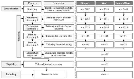 - For the final step at the screening stage, by tailoring the string and eliminating “OR environmental,” more accurate results were achieved, and the number of documents was reduced to 40, 43, and 35 for Scopus, WoS, and ScienceDirect, respectively (118 studies in total).