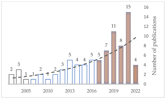 The year-wise analysis gives a picture of the research progress. It may be challenging to discern a clear trend based on recent studies. To better understand how interest has grown in this topic, the years 2000–2016 were added to the research period. Figure 4 provides information about the number of published studies from 2000 to February 2022. The overall trend emphasizes accelerated growing interest in gasification technologies’ study through the lens of life cycle thinking. The highest contribution belongs to 2021 by 15 publications, almost 100% higher than publications in 2018. Although there are four listed publications within the first two months of 2022 so far, it is expected to have many more upcoming publications. The significant drop in 2020 may be due to the COVID-19 pandemic when it reaches its peak.