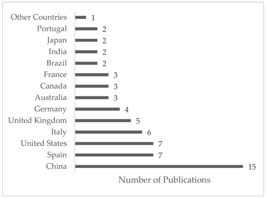 Country-wise analysis of the selected publications shows that twenty-eight countries contributed to this topic. As seen in Figure 5, the highest contribution belongs to China with 15 studies, followed by the United States and Spain with seven publications each, and Italy with six. Fifteen countries were involved in only a single study categorized under “Other Countries.” Austria, Chile, Colombia, Denmark, Iran, Ireland, Malaysia, Philippines, Qatar, Romania, Saudi Arabia, Singapore, South Africa, Switzerland, and Thailand belong to the group with one publication. In another classification, over seventy percent of the contribution belongs to the developed countries.