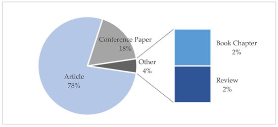 As discussed earlier, all types of publications were considered in this review. Over eighty percent of selected documents were articles, followed by conference papers (fifteen percent) and book chapters and reviews (two percent each). As seen in Figure 6, only two review articles demonstrated the study’s significance. Ramos and Rouboa [66] reviewed different aspects of life cycle thinking (environmental, social, and economic) on plasma gasification. On the other hand, Michaga et al. [67] conducted a techno-economic and life cycle assessment review on jet fuel produced through biomass gasification.