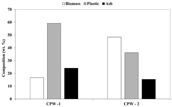 The two samples used in this work differ in the proportion of polymers and lignocellulosic material, assessed through the selective dissolution method, as described by Ariyaratne et al. [25]. CPW-1 presented 17% of lignocellulosic material, 59% of polymers, and 24% of ash, while CPW-2 had approximately 49% of lignocellulosic material, 36% of plastics, and 15% of ash. The visual appearance of the two samples can be seen in Figure S1 (Supplementary Data).