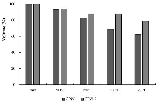 One of the benefits of waste torrefaction before its valorization is the observed volume reduction, which leads to an increase in density. This physical property has implications on the decision-making process for waste valorization because wastes with higher bulk density are easier to handle, transport, and store, increasing the efficiency of the process and reducing costs [35]. Biochars produced in this study had an increase in apparent density from 12.1 to 37.9% and these results are in accordance with values for biochars obtained from different raw materials that show an increase in apparent density in the range of 13 to 55.6% for lignocellulosic and refuse-derived fuel wastes, respectively [20,36]. According to Figure 2, the volume reduction was positively correlated to the torrefaction temperature reflecting the transition from the lignocellulosic and polymeric structures to the more aromatic carbonaceous structures of the biochars [37]. This effect was more evident for CPW-1, composed mainly of polymers that have typically low apparent densities [38]. Transportation and landfilling represent large environmental impacts due to the high consumption of fossil fuels and release of NOx and methane–air emissions coupled with heavy metal water emissions, respectively [39]. As such, this volume reduction via torrefaction seems to be an attractive way to significantly reduce the costs and increase the sustainability of waste valorization. Moreover, when waste valorization is not possible, landfilled wastes would require a smaller area.