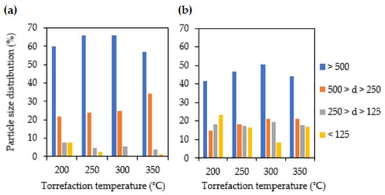 Particle size distribution showed a different pattern between both samples (Figure 3). As CPW-1 has higher amounts of polymers, increasing torrefaction conditions lead to a particle size increase, mainly due to agglomeration caused by the melting of the polymeric fraction of the samples. As polymers melt during thermal treatment, the fine particles become stuck in this material and produce larger particles. This behavior is more evident in more severe torrefaction conditions, and larger particles were observed for the char produced at 350 °C for 60 min.