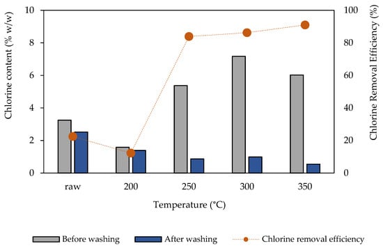 The washing process reduced the chlorine content of the raw material and the biochar obtained at 200 °C, but chlorine removal efficiency was below 25% and corresponded to the solubilization of inorganic chlorine species present in the biomass fraction. As for the biochars, initial chlorine concentrations were higher than 5% and chlorine removal efficiencies between 84 and 91% were obtained after washing with hot water, reaching final chlorine concentrations lower than 1%, a value adequate for solid fuels for use in boilers or gasifiers [21]. These results indicate that torrefaction at temperatures above 250 °C concentrate the chlorine present in the raw material in the biochar product, but in the form of inorganic chlorine that may be removed by washing with hot water [24]. The reduction was more evident in chars produced at higher temperatures, reaching 91% chlorine removal for the chars produced at 350 °C. Nonetheless, maximum chlorine concentration in the char was observed at 300 °C, indicating that some chlorine was eliminated with the gas products and tars during torrefaction at 350 °C.