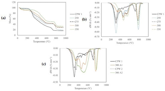 As seen in Figure 5a, torrefaction treatment increased the thermal stabilities of the cork wastes. For instance, at 750 °C, the raw waste lost 80% of its mass while the chars obtained at 350 °C suffered a 50% mass loss, while raw cork waste showed about 80% mass loss. The thermal degradation of this type of mixed waste involves devolatilization and char decomposition reactions [40]. As can be seen from Figure 5b, cork-polymer wastes undergo a devolatilization reaction at temperatures of approximately 310 °C and two char decomposition reactions at temperatures between 440 and 800 °C. Dehydrochlorination reactions take place along with biomass devolatilization reactions [53]. The devolatilization reactions occur at a higher rate in raw cork-polymer wastes or lower temperature chars due to their higher volatile content. Interestingly, the two cork-polymer wastes showed similar thermal decomposition patterns indicating that after carbonization both exhibit a homogeneous carbonaceous structure (Figure 5c). The waste chars also showed similar degradation rates but their devolatilization and char decomposition patterns varied. The peak temperatures of the first and second char decomposition reactions occurred at slightly higher temperatures for CPW-2 and derived chars. The overall results indicate that maximum thermal degradation temperatures range between 750 and 800 °C for cork-polymer wastes and cork-polymer chars, respectively. It is likely that the fillers applied in the PVC mixture increased the thermal stability of the mixed wastes [54].