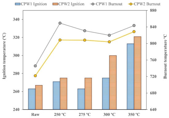 The variation in ignition and burnout temperatures of raw cork-polymer wastes and cork-polymer chars produced at 250 °C, 275 °C, 300 °C, and 350 °C.