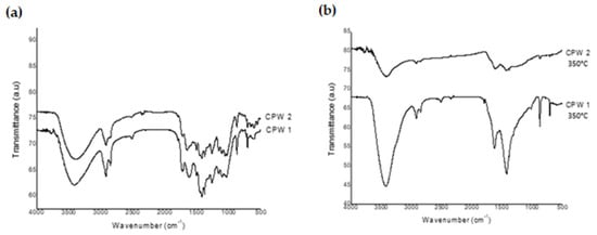 FT-IR Spectra of (a) CPW−1 and CPW−2 and (b) CPW−1 and CPW−2 chars produced at 350 °C and 30 min.