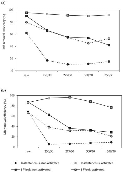 MB removal efficiencies for (a) CPW-1 and respective chars and (b) CPW-2 and respective chars.