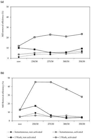 MO removal efficiencies for (a) CPW-1 and respective chars and (b) CPW-2 and respective chars.
