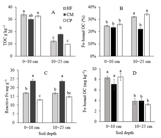 Total organic carbon (TOC) (A), organic carbon preserved by Fe (OC_Fe) (B), reactive Fe (C), and Fe-bound OC (D) in forest (HF), cropland (CM), and pasture (CP) soils at 0–10 cm and 10–25 cm depth. Different lower-case letters indicated significant differences at α = 0.05. The error bar represented the standard deviation (n = 3).