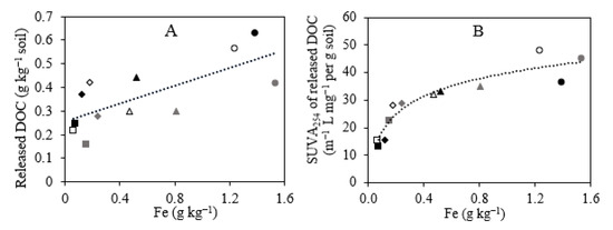 Regression relationship between the amount of released DOC (A) and SUVA254 of DOC released (B) from soils after 0.5 N HCl at 0–10 cm (diamonds) and 10–25 cm (squares), 0.25 N HCl and 0.25 N NH2OH·HCl extraction at 0–10 cm (circles) and 10–25 cm (triangles) in hardwood forest (black fill), cropland with manure (gray fill), and continuous pasture (no fill). Panel A: Released DOC (g kg−1 soil) = 0.19 × Fe (mg L−1) + 0.16, r2 = 0.54, p < 0.01; Panel B: SUVA254 of released DOC (m−1·L mg−1 per g soil) = 9.27 × ln (Fe) (mg L−1) + 39.84, r2 = 0.89, p < 0.0001.