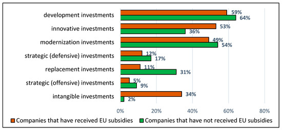 In a classification based on the types of the investments made by the enterprises in the SME sector in both groups included in the survey during 2007–2015, it was investments of a developmental character that were most frequently indicated (Figure 1). The noticeable difference between the two groups in the survey concerns investments the result of which was implementation of innovation. This kind of investment was made by over half of the entrepreneurs (53%) who received subsidies from the operational programs.