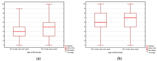 It should be emphasized that the entities that have received EU aid have a stronger perception of investment as an important factor determining the company’s development. On the other hand, both groups of respondents agree with each other and confirm the thesis that undertaking an investment is a condition for the company to remain on the market, and investment activity contributes to increasing the competitive position of such an entity. In addition, in both examined groups, half of the respondents express the view that innovation cannot be treated as the only area of investment aimed at increasing the competitive advantage of an enterprise. However, there is a visible difference in the responses between the examined groups in the event of a problem that companies from the SME sector have easy access to using many forms of external investment financing. Only 16% of respondents who did not receive EU subsidies were of this opinion, and 61% of them do not accept the amount of costs incurred to obtain external financing. However, one in three entrepreneurs from the group that received the EU grant think that it is easy to obtain external financing, and 66% of this group of respondents accept the cost of obtaining external financing.