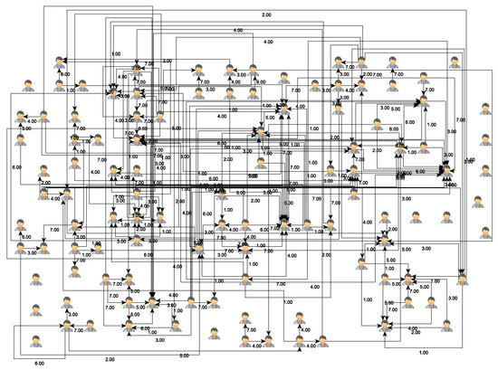 As already stated in Section 2, the performance is approximated as a function of the network centrality, modeled considering the relations among the employees, and in particular the informal network (Bonacich 1987; Freeman 1977). The informal network has been built ignoring the vertical relation among supervisor and employees, and has been created by a questionnaire asking with whom and how many times it is necessary to interact to perform the assigned task. In particular, employees were asked to declare up to 10 members of the organization they need to relate more directly and more frequently with, to improve or facilitate the conduct of their activities. The Likert scale used ranged from 1 (contacts infrequent, some once a month) to 7 (several times a day). Through the collected information it was possible to build an adjacency, squared and not symmetrical matrix. Only the relationships between employees belonging to the same level have been considered, to detect only those which can be defined “horizontal”. Figure 1 shows the built network. Each node in the network represents an employee and the arrows represent the interactions between two employees. It is worth noting that to represent the frequency of the employee interaction each arrow as a weight.
