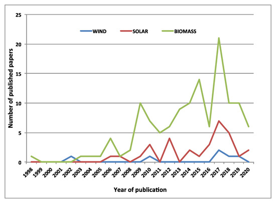 The total number of energy efficiency scientific papers was 162. Six were related to wind, 31 concerned solar, and 125 regarded biomass energy. The first paper was published in 1998, and the most recent studies were published in 2020, covering more than a 20-year interval. Since 2009, the quantity of studies has significantly increased with an average of 15 papers per year, but there was a considerable reduction in the last years (Figure 2 and Figure 3).