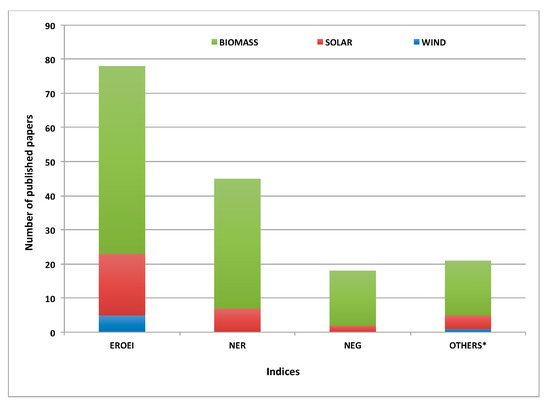 Moving towards reviews on EE indices applied to a specific RES, many of them are related to energy from biomass, followed by solar–PV and, lastly, by wind.
