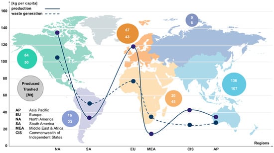 Worrying? Of course, this is not a sudden change. The historical data, in retrospect, tells us the dramatic development of this silent chaos. 15 million tonne [Mt] of plastic was globally produced in 1964, which grew to 311 Mt in 2014. This further grew to 359 Mt in 2018 (PlasticsEurope 2015, 2019; WEM 2016). Present estimates warn us that this figure will triple in the next three to four decades (Lebreton and Andrady 2019). Figure 1 illustrates annual virgin plastic production (figures on the top) and plastic trashed as waste (figures on the bottom) in million tonne [Mt] across different regions in year 2010 (PlasticsEurope 2011). Additionally, the per capita virgin plastic production (solid line) and waste generation (dotted line) are also plotted giving different regional perspectives.
