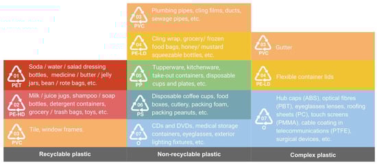 There are different classifications of the plastics based on their constituent components, reusability, synthesis process, etc. In this work on circular economy of plastic waste, we classify them in three types, namely, recyclable, non-recyclable, and complex or unknown. The types of plastics considered here are as per the European classification described in (European Commission 1997). The most commonly produced plastics under these types are shown in Figure 2.