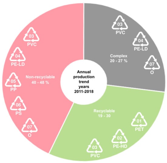 Potentially recyclable, non-recyclable, and complex plastics based on global annual production data for years between 2011 and 2018.