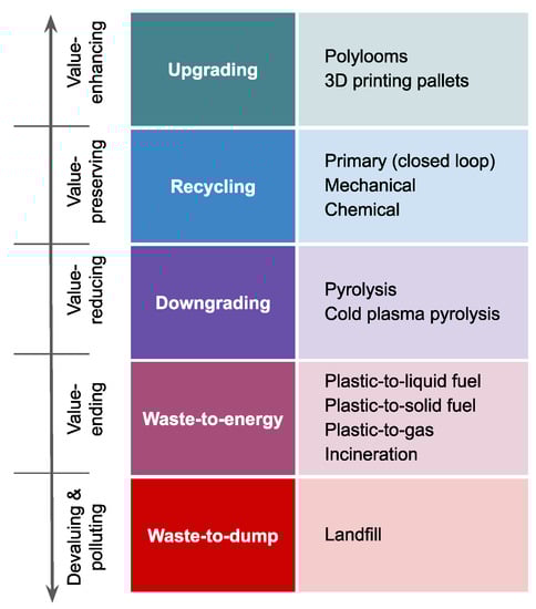 - Ragaert, Kim, Laurens Delva, and Kevin Van Geem. 2017. Mechanical and chemical recycling of solid plastic waste. Waste Management 69: 24–58. [Google Scholar] [CrossRef]