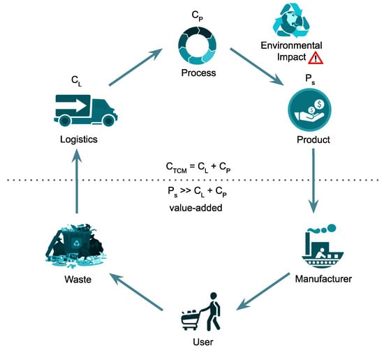 The sum of logistics () and processing () costs is the total transactional cost of the processed material () after their respective processes as illustrated in Figure 5. The selling price of the material () should be more than the for any recycling process to be profitable. Here, we have not taken into account the cost of environmental degradation. To incorporate environmental cost, we need further investigation to carefully study the short-, medium-, and long-term impacts of the respective processes.