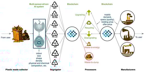 Blockchain and multi-sensor-powered artificial intelligence interfaces for plastic waste recycling.
