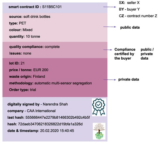 The public data is open for the validators to scrutinize and approve. The private data, however, is closed information only accessible to the seller and buyer involved in this contract. The validation of the private data is only possible through the buyer. Typically, information related to price, segregation methodology, origin of waste materials, order-type are contained in the private data. These information are hidden not to compromise the competitive-edge of each seller offering similar products. Most importantly, the buyers can validate and approve information related to quality compliance and issues related to purchased products. This information related to quality compliance and issues can be kept public or private depending on preferences set in the smart contract. Additionally, each smart contract will be digitally signed and timestamped through a validation protocol.