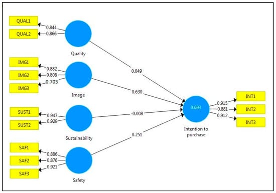 Table 5 shows the path coefficients of the relationship between variables and consumers’ purchase intention, corresponding t-values and the level of significance. The obtained results indicate that consumers’ intention to purchase recycled products is significantly influenced by their positive and favorable image and by their perceive safety. More precisely, when examining consumers’ acceptance of recycled products, the product image was found to have the highest impact on purchase intention (β4 = 0.630 **; p = 0.000). Similarly, a direct significant impact was found for product safety on purchase intention (β1 = 0.251 **; p = 0.003), with its influence on purchase intention being slightly lower than image. Therefore, the positive image and the product safety is the stepwise order of the influence of the attributes of recycled products on purchase intention. Therefore, it can be stated that the better product image—understood as positive favorable image—and the greater product perceived safety, the greater the consumer purchase intention.