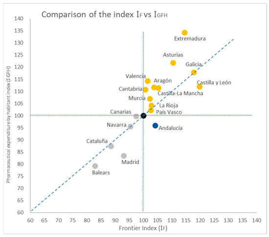 The graph is divided into four quadrants. Quadrant IV, bottom right, is characterized by having unfavorable conditions but spending less than average, a symptom of the proper functioning of its pharmaceutical services. The regions located in this quadrant are in blue. Quadrant I, upper right, is the most sensitive group, formed by the regions that have an unfavorable context and, besides, have an expenditure above average. We have represented them in yellow. In quadrant II, upper left, we obtain the regions where the conditions are favorable and also have an above-average expense; these are in brown. Finally, quadrant III, bottom left, are regions with a favorable context and a reduced expense. These are grey. The central point, represented in black, is the national average.