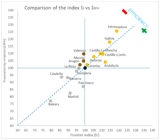 The frontier methodology is frequently used to measure the efficiency of public organizations, and it is known as the hidden cost of public production. This consists of comparing the cost incurred by a Public Health Service in producing a particular good or service with the cost of production that would be obtained if the good or service was carried out by a private company, the latter using the same production factors as the former. The idea is to know the excess or deficiency of the cost incurred by the public sector concerning the private sector, and this excess or deficiency is attributed to the lesser (inefficiency) or greater efficiency of the Administration (Wagstaff 1989; Afonso and Kazemi 2017). In our case, this method is revealed to be inadequate because private health companies do not usually fund medication, only that provided in hospitals. Therefore, the frontier efficiency model must be sought in the public sector. Considering that a commonly accepted reference is the national average for indicators such as the growth of spending or spending per capita, we have built our efficiency frontier around this national average. The frontier variable that we have chosen is the pharmaceutical spending per inhabitant that reflects the objective of pharmaceutical management efficiency: provide the right medication at the lowest cost.