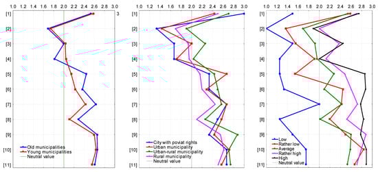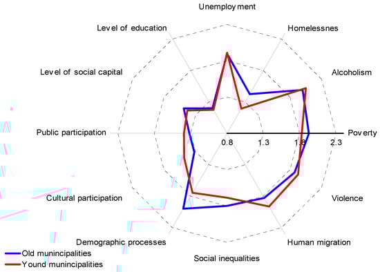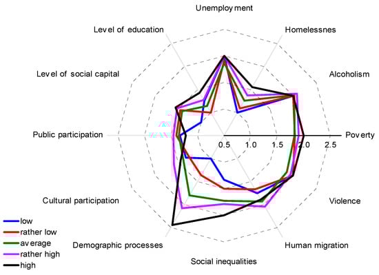 The results of analyses carried out in the area of diagnosis of social issues currently affecting municipalities are illustrated in Figure 2, Figure 3 and Figure 4 in the form of radar charts. The respondents representing municipalities provided answers on a three-point scale, where 1 meant that the given issue did not occur and 3 meant that the phenomena was very intense. The purpose of the synthetic presentation of data in diagrams is to present the arithmetic averages of the response value, whereas in-depth analyses were carried out on raw data.