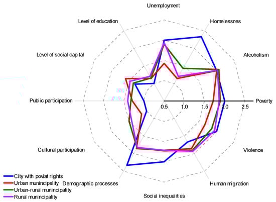 Assuming the type of a municipality as a criterion, there is a markedly greater variation in the assessment of the severity of particular social issues than in the case of division into old and young municipalities (Figure 3). In particular, cities with poviat rights stand out; in their opinion, demographic processes and homelessness are more noticeable than in other types of municipalities. In turn, problems related to human migrations, low participation in cultural and public life, and low level of education are clearly moved to the background. In the case of other areas, their degree of intensification is similar for all types of entities studied. However, it should be noted that the most noticeable issues are social issues such as: alcoholism, unemployment, human migration, violence, poverty, and unfavourable demographic processes. All types of researched municipalities assessed that these issues occur at an increased level.