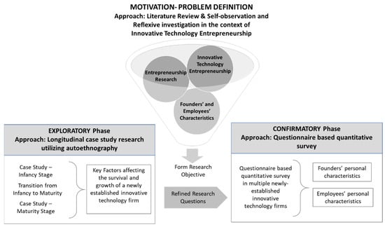 - A confirmatory study using a questionnaire-based quantitative survey. This was a refined research questions- and hypotheses-testing approach. The objective was to confirm the findings and test the proposed refined research questions from the previous phase. The quantitative analysis was conducted in multiple newly established innovative technology firms (theoretical sampling), and helped us to test the significance of key factors identified in the previous (qualitative) phase, as well as to assess their impact on the survival and growth of these enterprises.