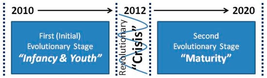 In this section, we detail the characteristics of a case study (in innovative technology entrepreneurship), as it evolved from its infancy stage, through its evolution, and into its current maturity. We refer to this case study as “Trek”, for the purpose of our investigation. Trek is a pseudonym for an established corporation in the field of online presence, with a significant market share in the Greek market. The company has exhibited significant growth, and has survived through its crucial decade (from its establishment in 2010 until today—2020). Therefore, we chose to analyze it in depth, as it is a fitting example of an innovative technology enterprise that managed to survive, as well as succeed, in its market, and achieve long-term sustained growth. As part of the case description, we also utilize the business model canvas (), in order to get an insight on how Trek was (re)structured in its stages of evolution, in order to create and sustain value. Moreover, we have recognized and analyzed three stages () in Trek’s evolution: An initial two-year “evolutionary” growth stage (infancy and youth), followed by a “revolutionary” (crisis) phase, where the business’s ability to overcome it determined its evolution into its second “evolutionary” stage (maturity). This process of evolution in Trek can be reviewed in Figure 2.
