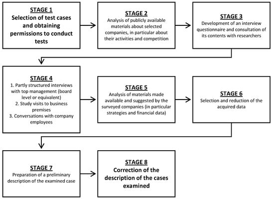 After obtaining permissions to participate in the survey, the publicly available materials were carefully analysed, including the use of company websites, industry portals, and press articles about them. In a third stage, an interview questionnaire was developed. This instrument gave direction to the interviews, but some of them were necessarily unstructured, which is natural for this type of research. It is impossible to predict what answers will be given and what specific aspects will be addressed by the respondents. At stage four, a number of interviews were conducted with the management of selected companies, followed by the analysis of materials made available by them (stage five). It should be noted that the interviews had to correspond to the adopted procedure for the identification of core competencies. At stage 6, the first version of the text was prepared, while at stage 7, this content was consulted and corrected.