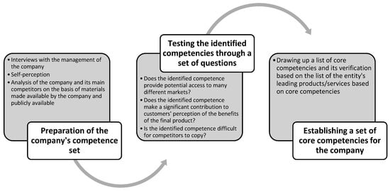Within the framework presented in Figure 2, a data analysis procedure consisting of three stages was adopted to identify the core competencies of the entities examined (Figure 3; see also: Siqueira and Bremer 2000). During the first stage, a set of competencies of the surveyed company was prepared. At this stage, care was taken to ensure that the indicated competencies were not assessed in any way, regardless of the source of the indication, including interviews with the managerial staff, author’s own observation (as part of study visits), and analysis of the company, its competitors, and their environment on the basis of available and publicly available materials, in particular, company reports including profit and loss accounts and annual balance sheets, internal studies, descriptions of organizational structures, promotional documents, press articles, and industry studies. In the second stage, it was verified whether and which of the identified competencies are core competencies. For this purpose, the test proposed by C. K. Prahalad and G. Hamel was used with a slight modification, which is based on three questions (Prahalad and Hamel 1990):