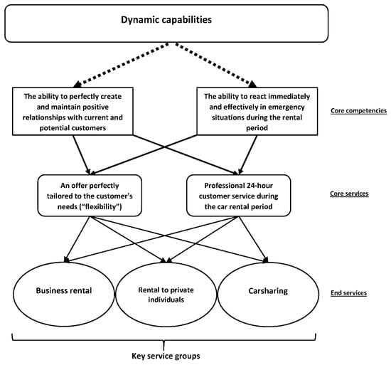 Both core competencies are reflected in the company’s services. It should be noted that a car rental service does not only consist of the vehicle itself, which is material and standardized, so it can be easily copied. The ownership of these resources by any other entity depends solely on its financial resources. As previously indicated, a sustainable competitive advantage cannot be built on a resource that is easily copied. Therefore, intangible elements accompanying the rental are decisive for the competitive position (see Figure 4).